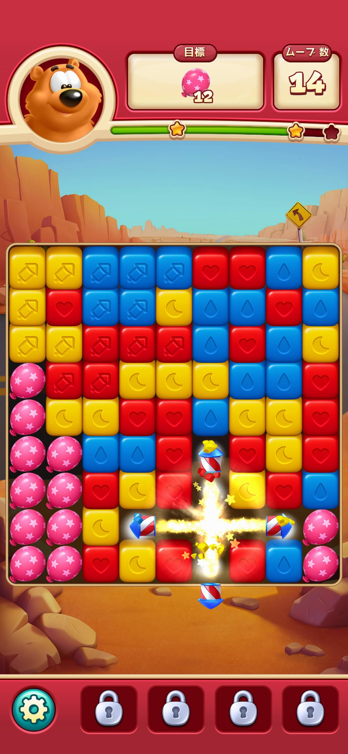 一度にたくさんのキューブを消すとロケットや爆弾、ミラーボールといった強力なブースターが出現し、これらを組み合わせることで盤面を一気に破壊できる爽快感も味わえます。