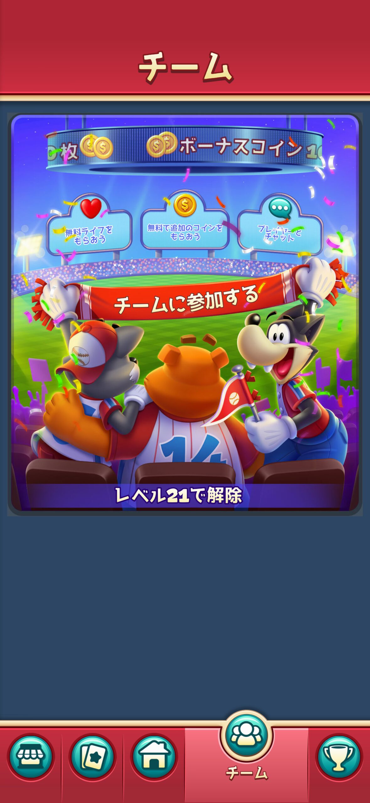 また、トゥーンブラストにはチーム機能があり、他のプレイヤーとチームを組むことでライフを送り合ったり、協力イベントに参加したりできます。