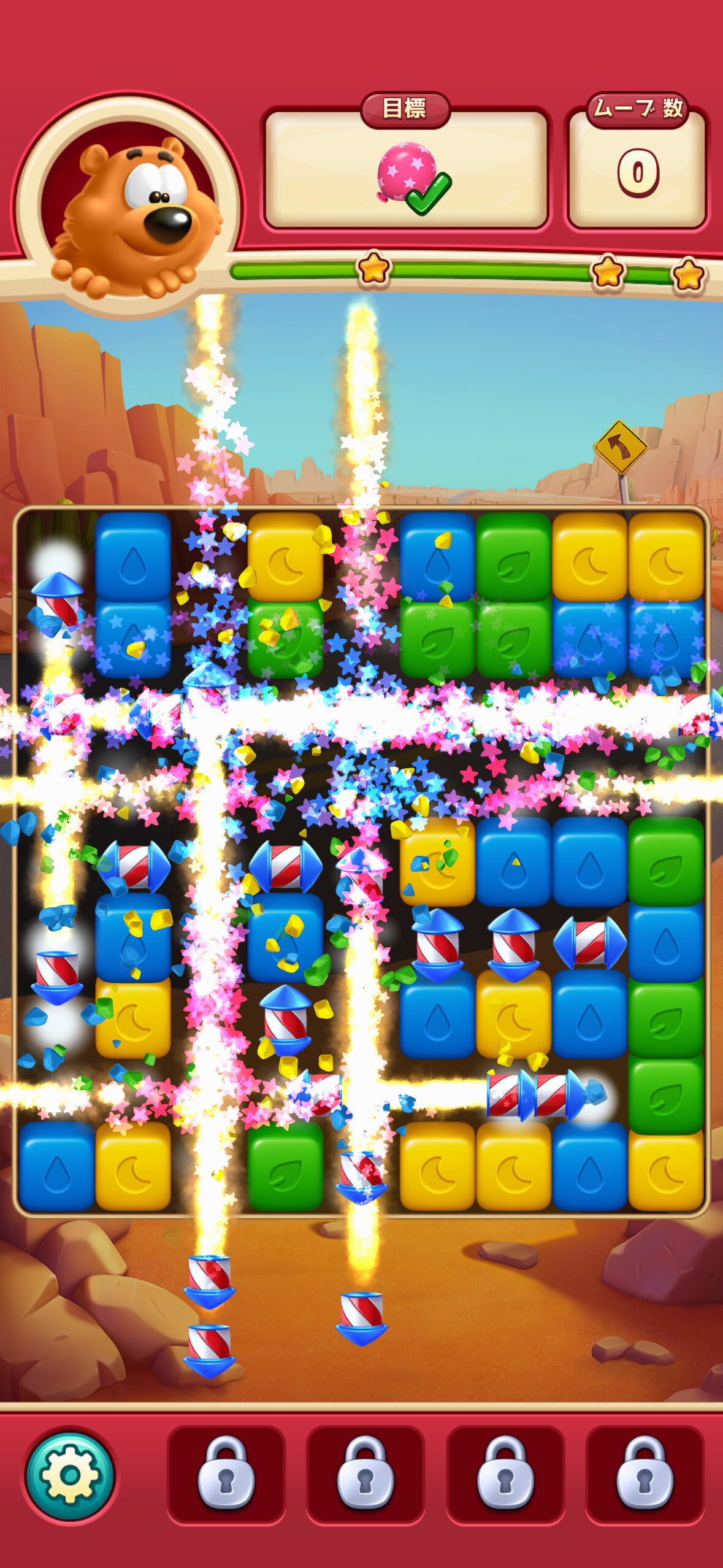 例えば、ミラーボールとロケットを組み合わせると、盤面中の同じ色のキューブがすべてロケットに変化し、一斉に発射されます。これにより、ほぼ盤面全体を破壊することも可能です。